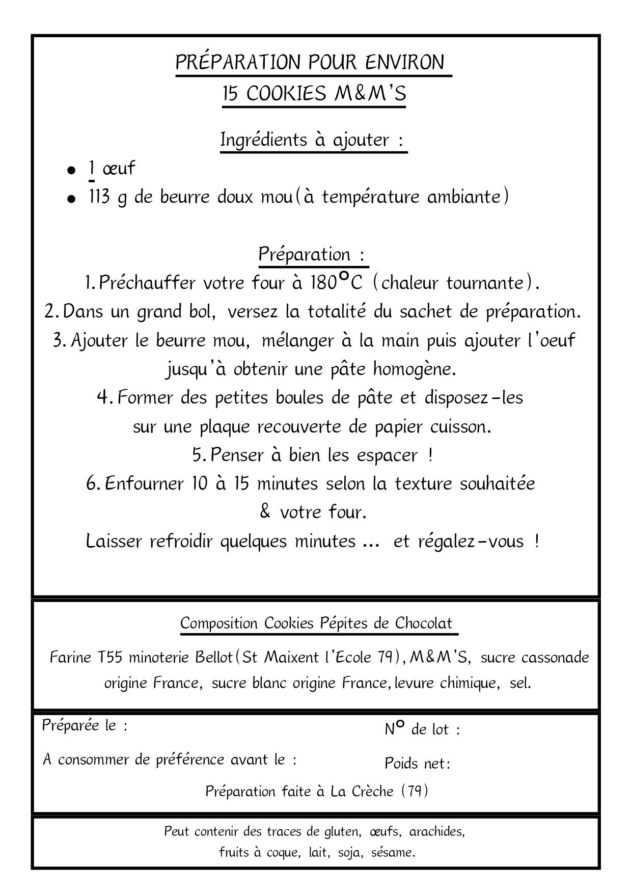 Offrez-vous le plaisir de savourer de délicieux cookies maison grâce à notre préparation artisanale aux M&M’S. Élaborée avec soin dans notre atelier situé à La Crèche, au cœur des Deux-Sèvres, elle allie simplicité et authenticité pour des biscuits irrésistibles.